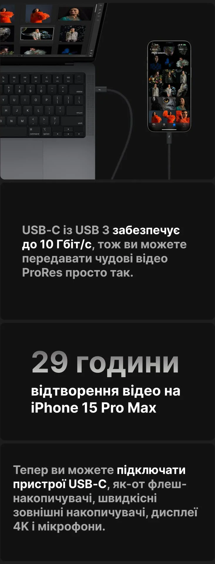 Остання та не менш знакова зміна — перехід із зарядного роз'єму Lightning на USB-C. Хоч на таке рішення Епл наштовхнуло відповідне розпорядження ЄС, воно помітно спростить процес зарядки ваших гаджетів, дозволяючи використовувати один кабель між ними всіма.