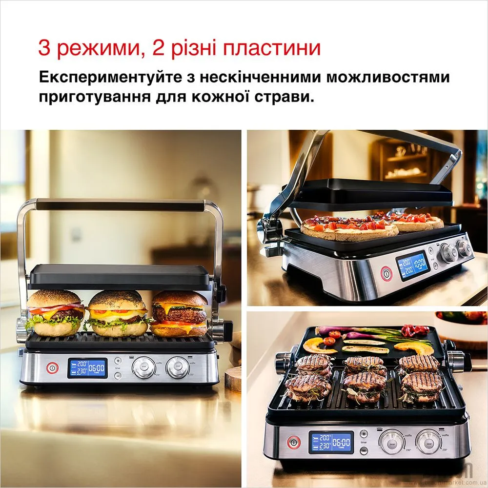 Унікальна фірмова конструкція підтримує три положення техніки. Режим «Піч» дозволяє регулювати висоту верхньої пластини, щоб ви могли легко працювати з будь-якими продуктами. Контактне положення дає можливість швидко готувати улюблені страви, адже випікання в ньому займає мінімум часу.
