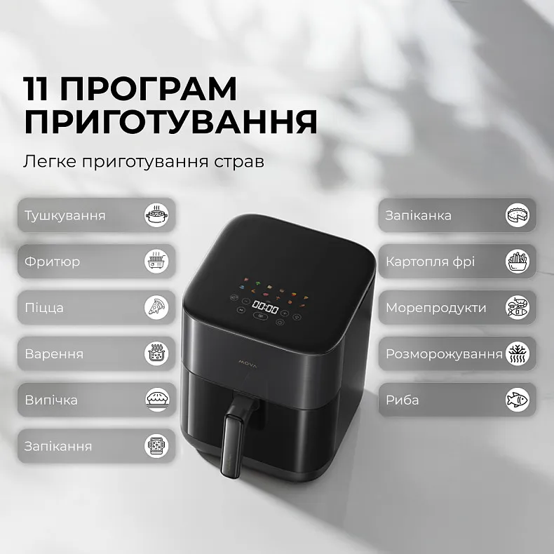 Завдяки технології гарячого повітря Mova AeroChef FD10s Pro дозволяє готувати страви з мінімальною кількістю олії або зовсім без неї, що робить раціон більш корисним. Ви можете насолоджуватися хрусткою скоринкою картоплі фрі, соковитим курячим філе або ароматними овочами без зайвих калорій. Такий спосіб приготування особливо цінують люди, які дбають про своє здоров’я, фігуру або активний спосіб життя. Мультипіч допомагає зменшити споживання зайвого жиру без втрати смаку. Це відмінний вибір для тих, хто хоче поєднувати смачну їжу і турботу про здоров’я.