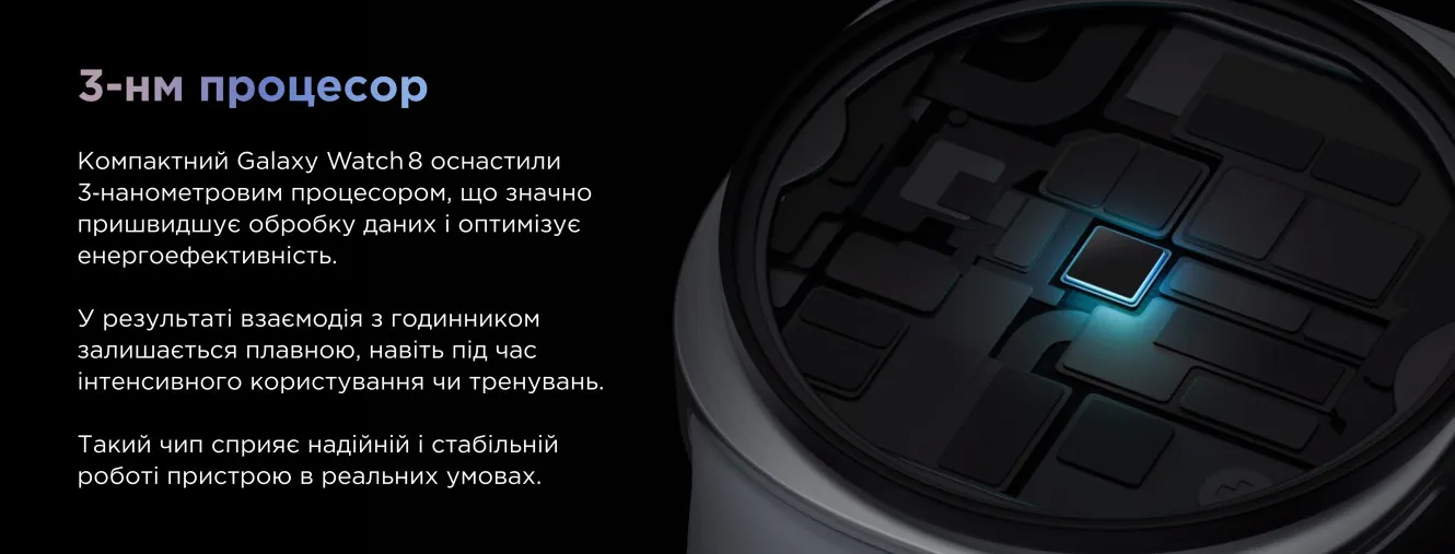 • Крім того, процесор оптимізує заряд акумулятора для тривалої роботи, гарантуючи, що Galaxy Watch 7 не відставатиме від вас.