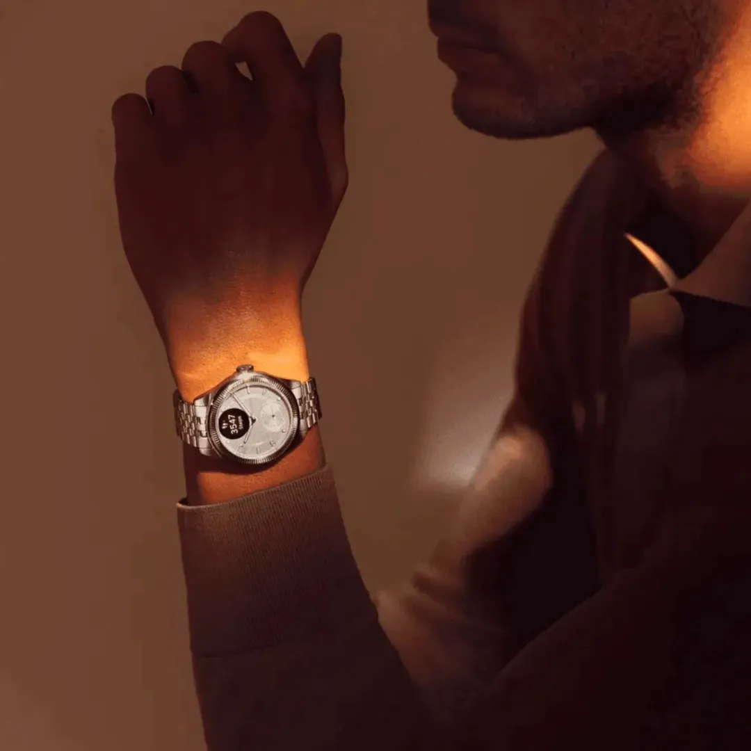 Аналогові стрілки гармонійно поєднуються з невеликим OLED-дисплеєм, який майже непомітний у повсякденному використанні, але відкриває доступ до ключової інформації у потрібний момент. Годинник виглядає як класичний аксесуар преміум-класу, а не як типовий гаджет.
