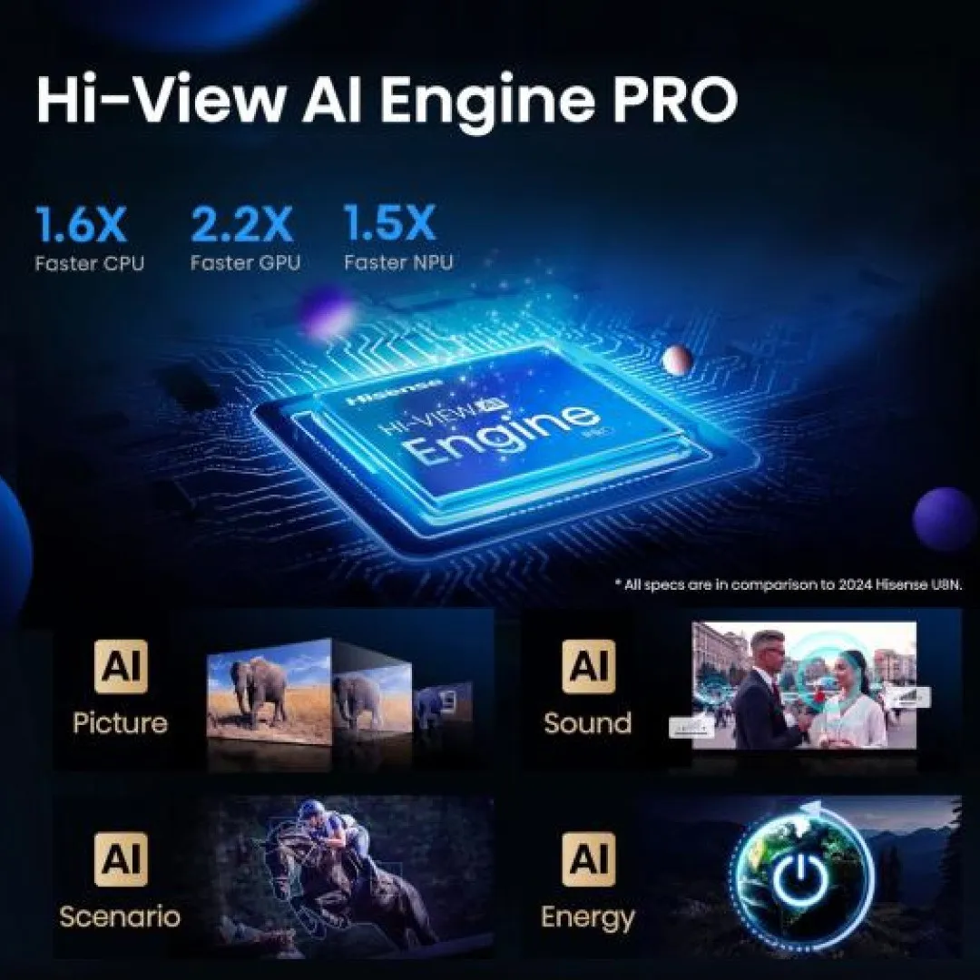 Сердцем Hisense 65U7Q PRO является высокопроизводительный процессор, который обрабатывает изображение в реальном времени. Алгоритмы искусственного интеллекта оптимизируют цвета, контраст и резкость, делая картинку максимально естественной. Контент с низким разрешением масштабируется до 4K с помощью AI Upscaling. Процессор обеспечивает стабильную плавность и яркость в любых сценах. Каждый кадр выглядит живым и детализированным, независимо от жанра контента.