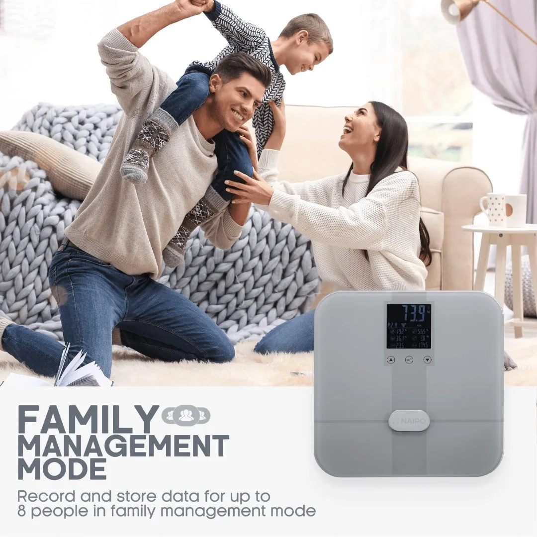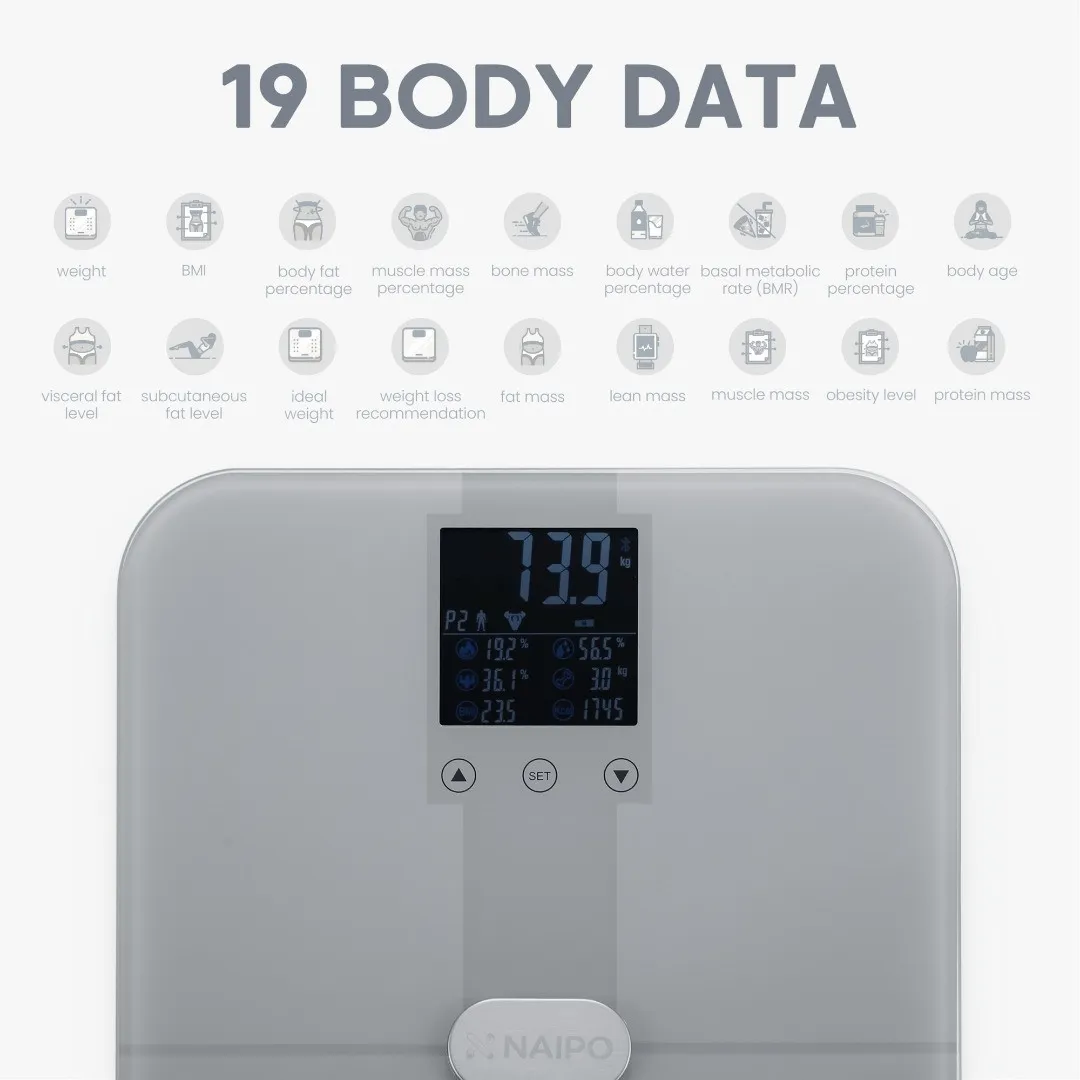 Коли ви стаєте на ці ваги, вони працюють для вас комплексно. Naipo NP-BS02 не обмежується лише показником ваги — за допомогою Bluetooth-зв’язку пристрій синхронізується з вашим смартфоном і передає дані у спеціальний додаток для детального аналізу. Ви можете відстежувати до 18 параметрів, серед яких маса тіла, частка жиру, м’язової та кісткової тканини, рівень води в організмі, індекс маси тіла (BMI), швидкість метаболізму та багато інших показників.