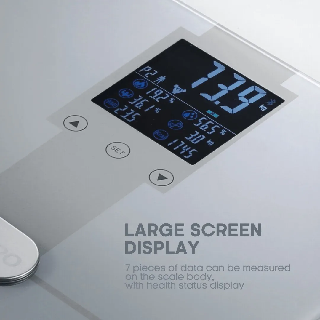 Ці розумні ваги чудово вписуються в інтер’єр будь-якої ванної кімнати чи спальні завдяки стильному дизайну з загартованого скла і компактним розмірам. Великий LED-дисплей дозволяє миттєво побачити основні показники, а легка вага та портативність дають змогу зручно переміщувати пристрій при необхідності.