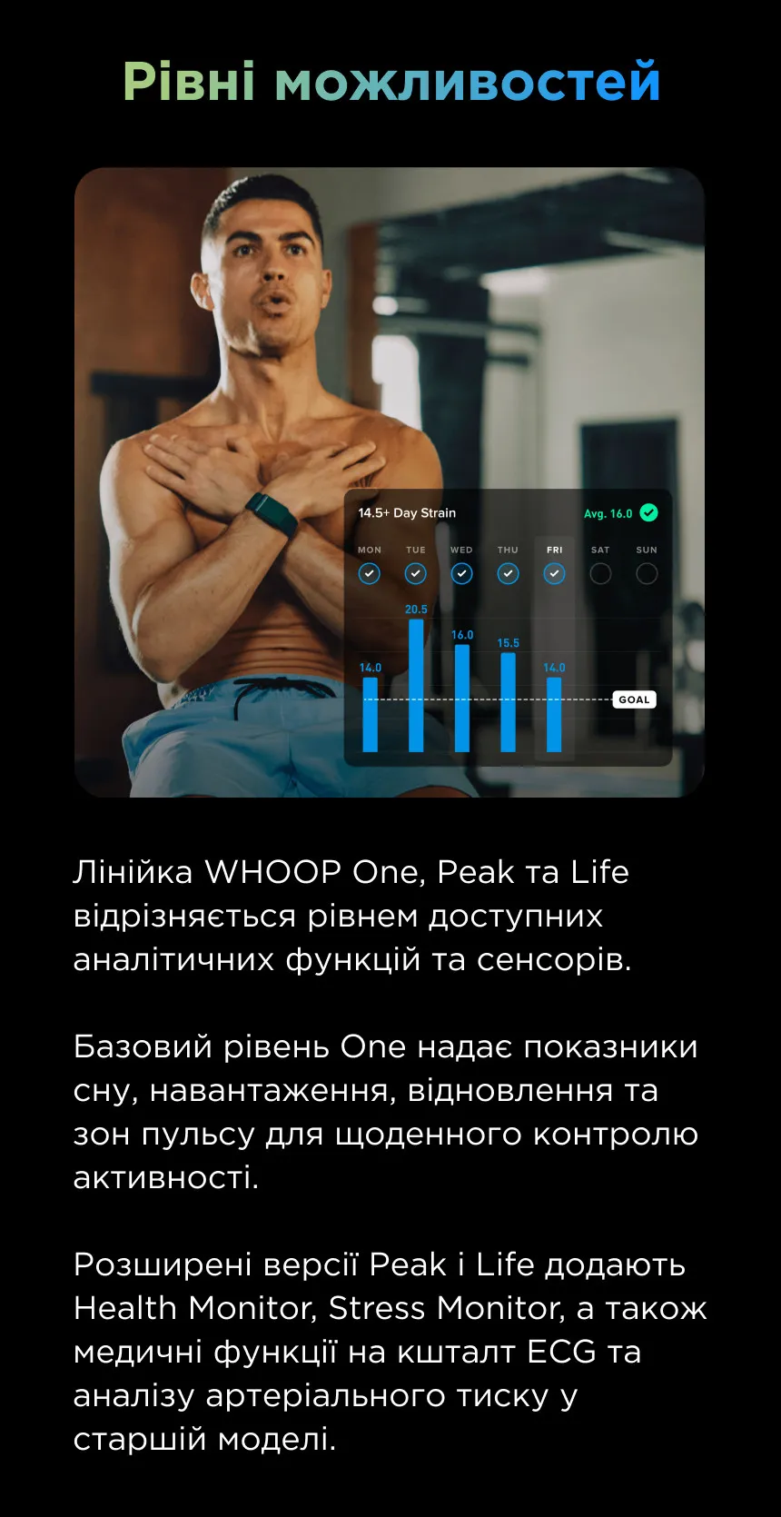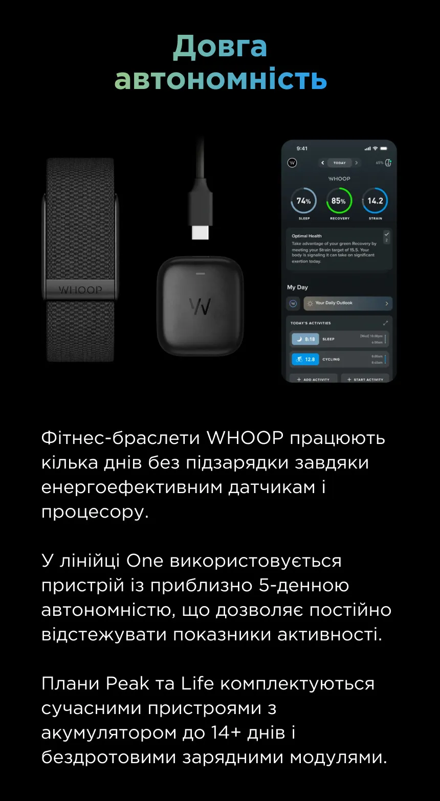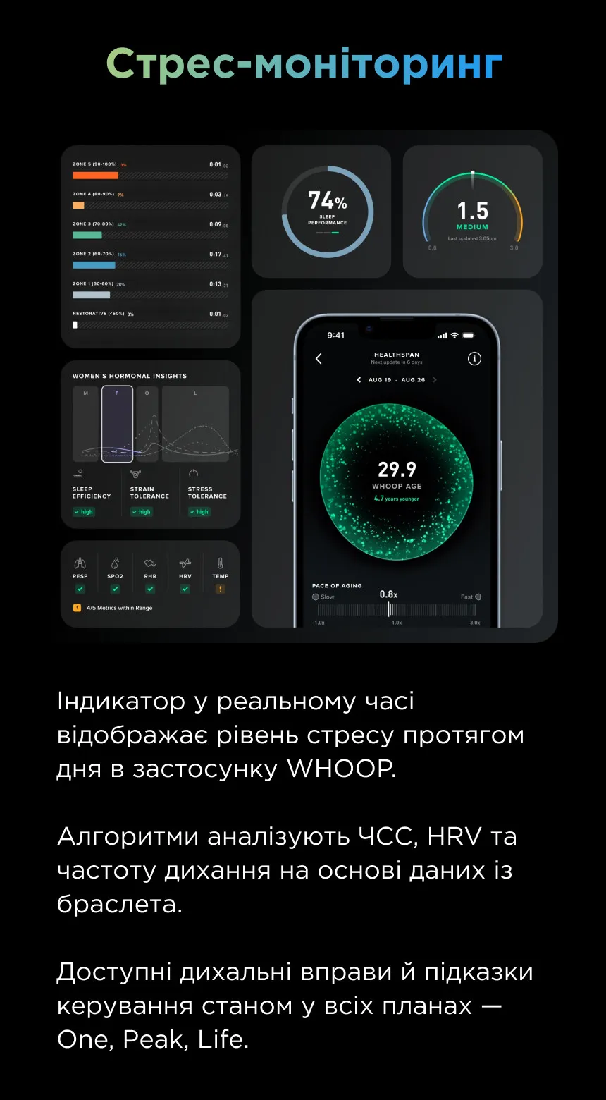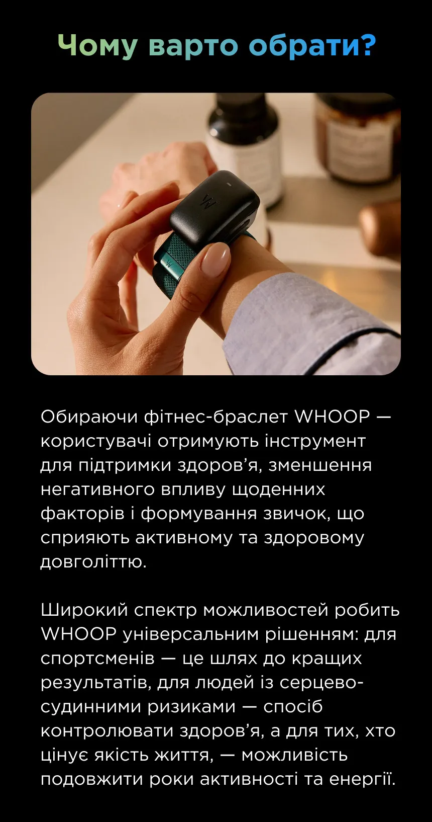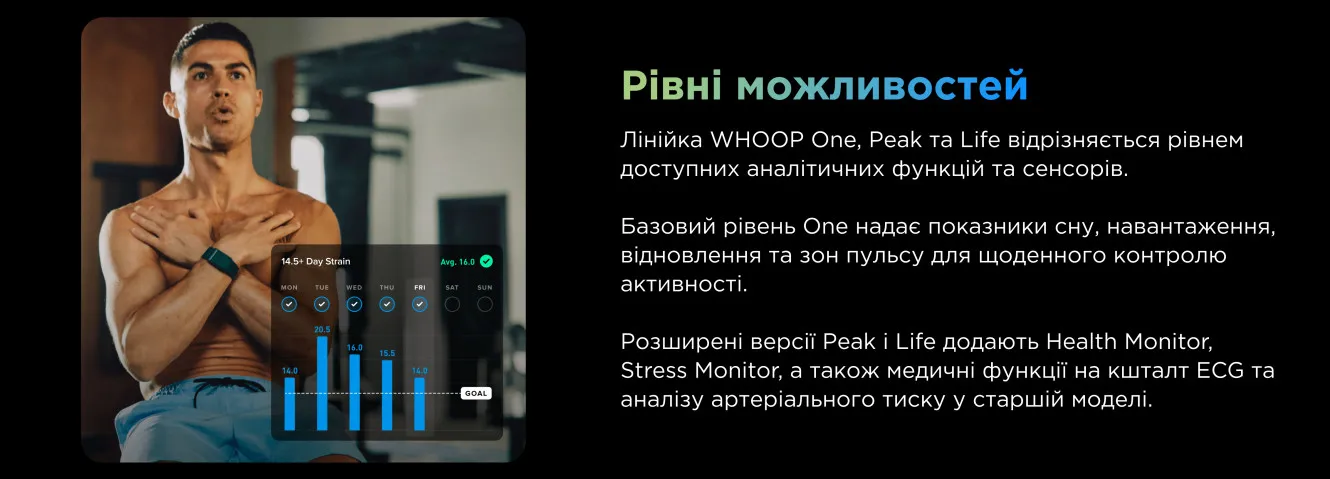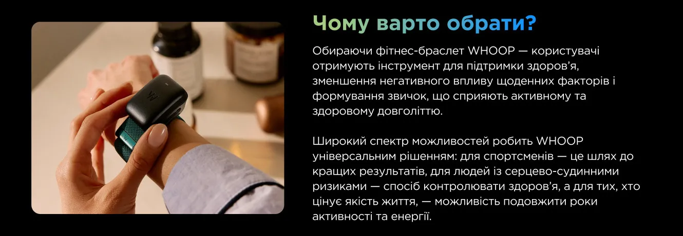 Это делает WHOOP универсальным решением: для спортсменов — путь к лучшим результатам, для людей с сердечно-сосудистыми рисками — способ контролировать здоровье, а для тех, кто ценит качество жизни, — возможность продлить годы активности и энергии.