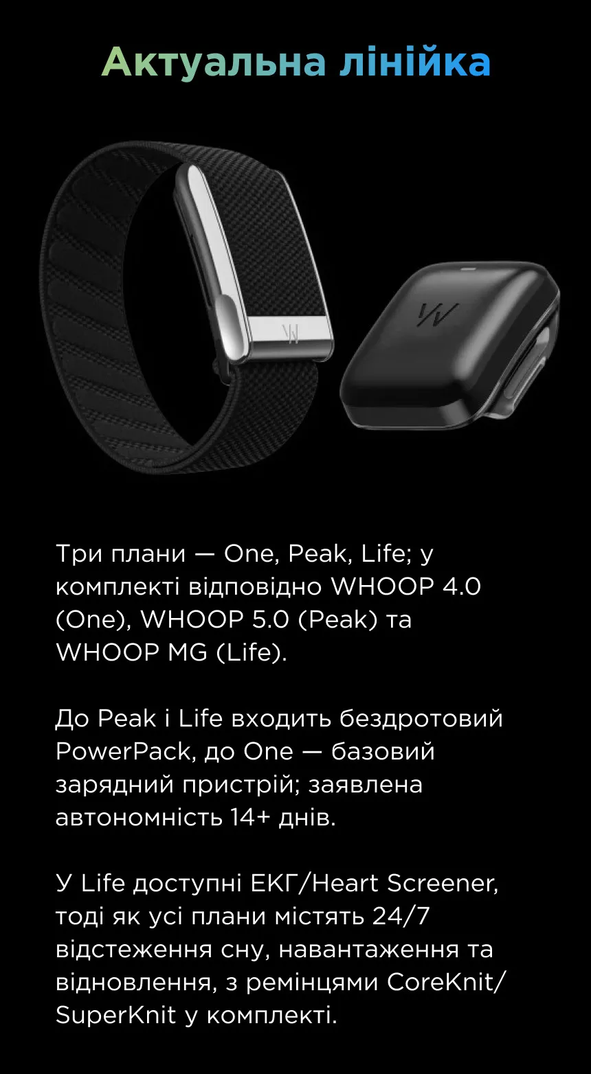 Модель WHOOP 5.0 является основой для тарифов One и Peak, тогда как WHOOP MG — для Life. Оба работают более 14 дней на одном заряде и оснащены высокоточными сенсорами. Подписки различаются по функционалу и аппаратному обеспечению, позволяя выбрать именно тот вариант, который нужен — от спортивного трекинга до полноценного медицинского мониторинга.