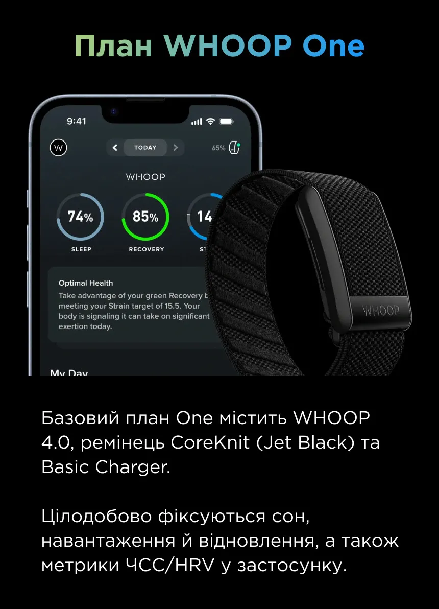 Базовый тариф, включающий WHOOP 5.0, проводное зарядное устройство, ремешок CoreKnit Jet Black и все ключевые функции фитнес-трекера: отслеживание сна, нагрузки, восстановления, VO₂ Max, зон пульса и персональные рекомендации. Есть также поддержка женских гормональных инсайтов, помогающих понять влияние менструального цикла на сон и восстановление.