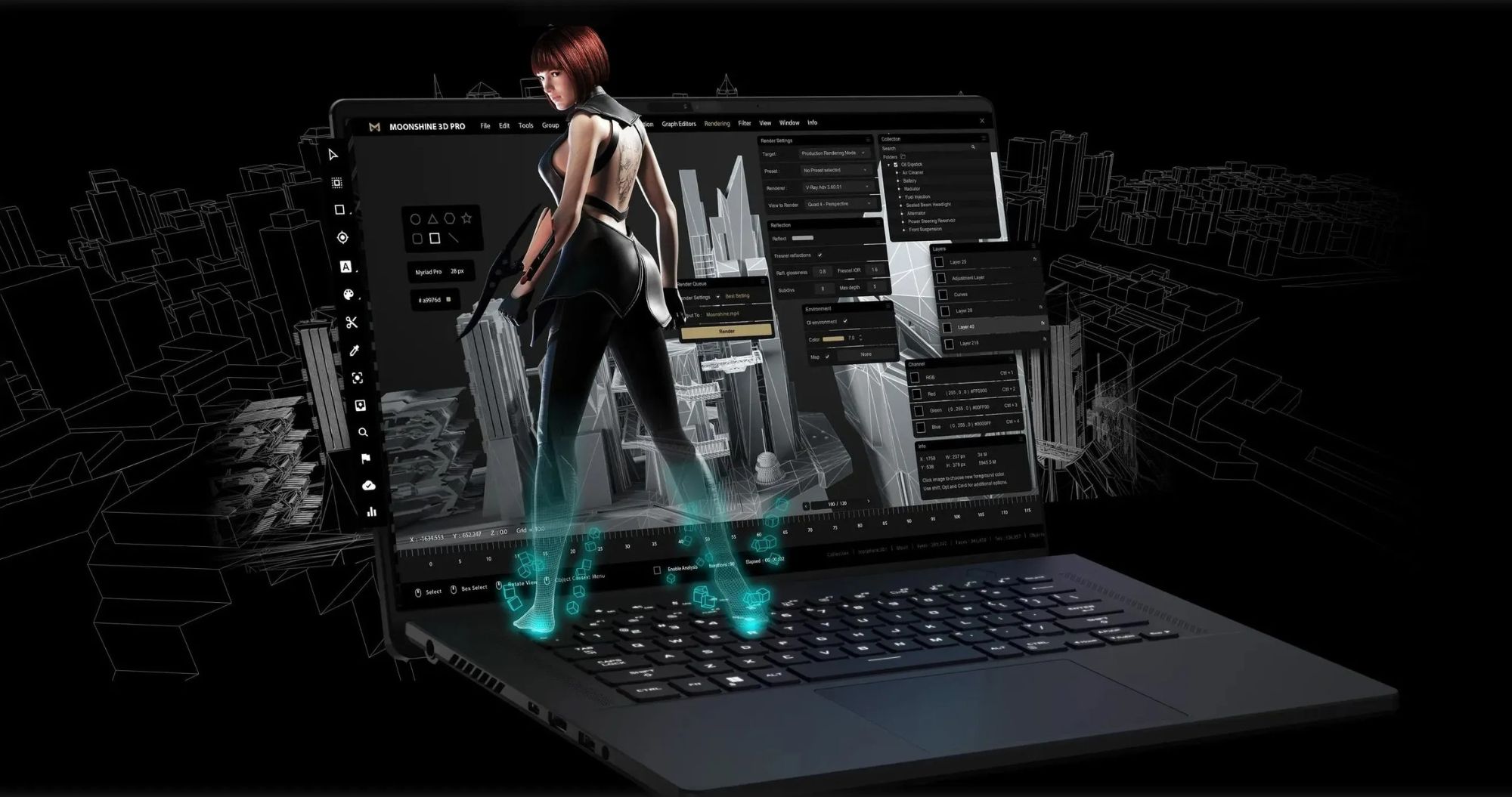 Благодаря DLSS 3.5 с генерацией кадров частота кадров возрастает до двух раз, а технология Ray Tracing создаёт реалистичные отражения и освещение. Для киберспортивных игр используется NVIDIA Reflex, уменьшающий задержку до 0,9 мс.