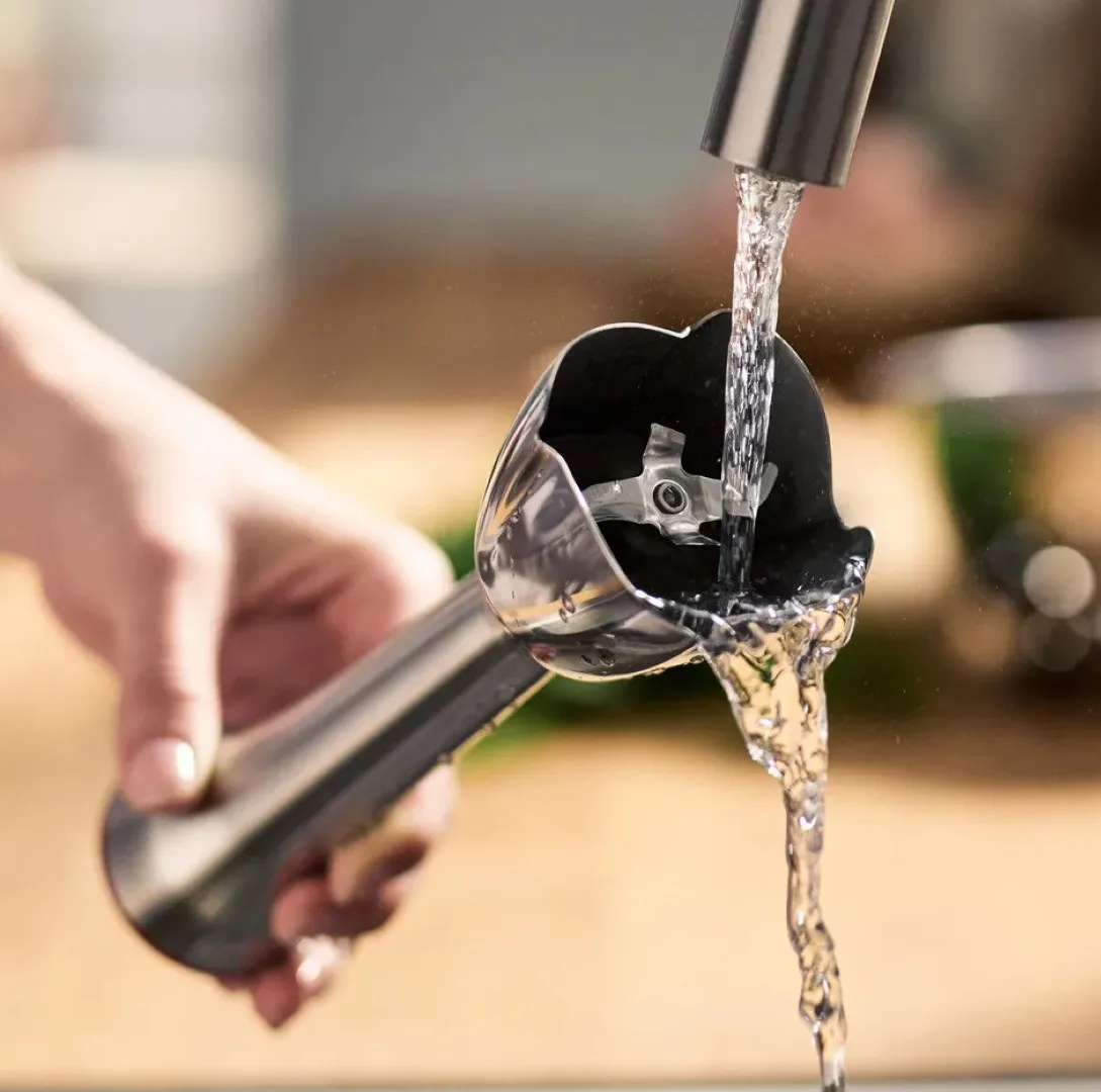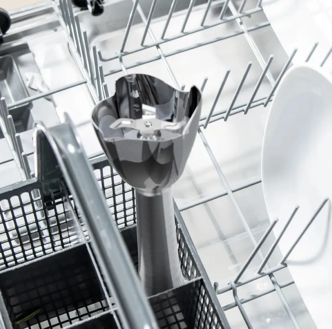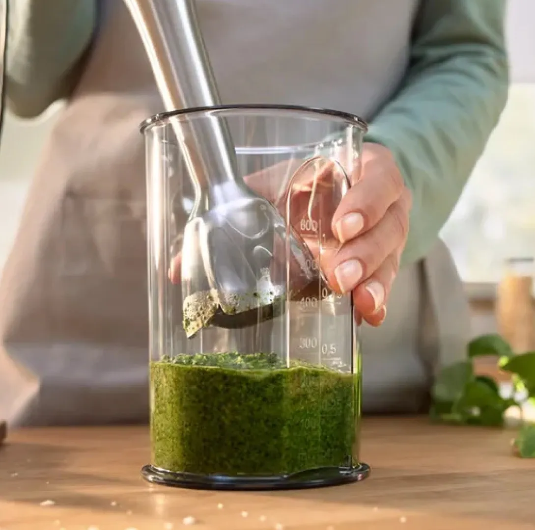 Блендер оснащён функцией Smart Speed — скорость изменяется силой нажатия, поэтому всё под контролем. Насадка с четырьмя лезвиями QuattroBlade измельчает равномерно и без брызг. Крепление насадок выполнено из керамики, а не пластика, поэтому не стирается со временем. Мотор оснащён системой охлаждения, что позволяет ему работать дольше без перегрева. Это сочетание мощности, точности и долговечности.