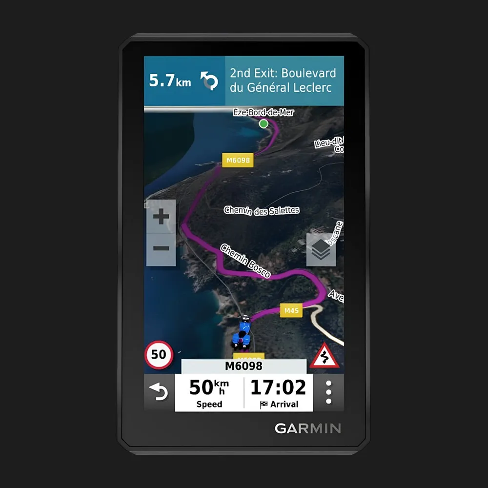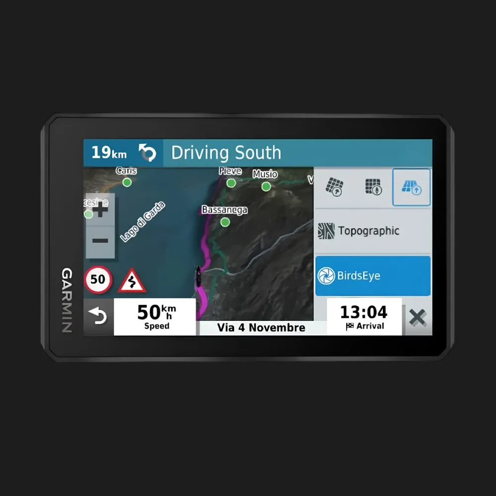 Навигатор оснащен большим сенсорным цветным экраном, который хорошо читается даже при ярком солнечном свете. Интуитивное меню и эргономичные кнопки позволяют быстро вводить маршруты и менять настройки во время движения. Дисплей отображает карту, скорость, расстояние, время и навигационные подсказки в реальном времени, делая поездку максимально комфортной и безопасной.