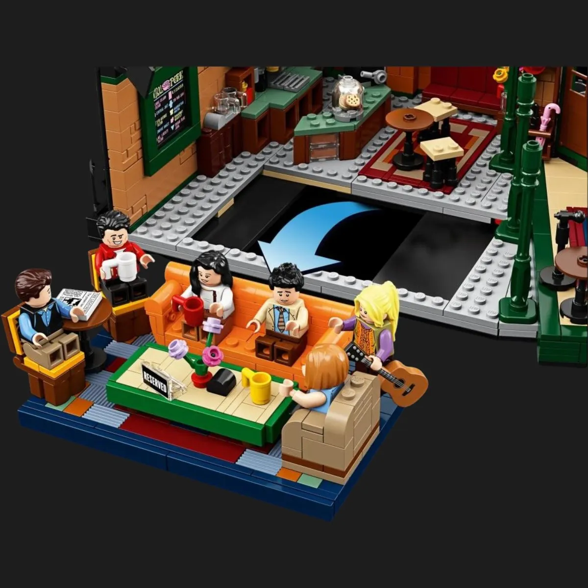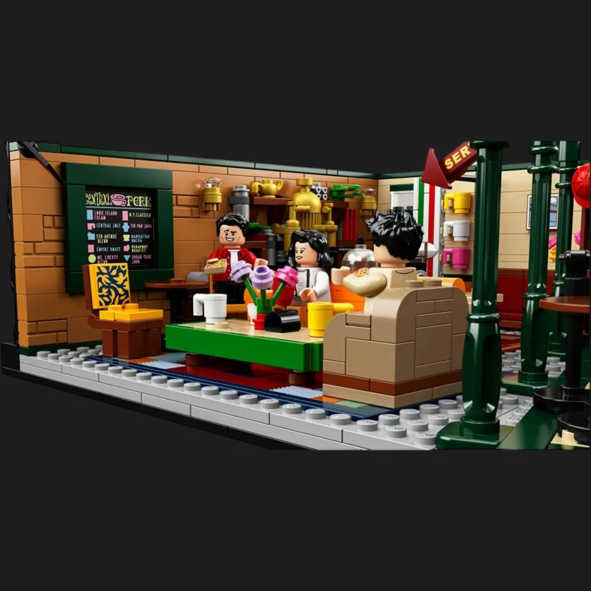 • Конструктор кафе CENTRAL PERK имеет культовую главную зону отдыха с диваном, креслом, 2 стульями и столом; зону обслуживания с кофеваркой, стойкой обслуживания, кассовым аппаратом, банкой для печенья с 2 элементами печенья, элементом меню и другими аутентичными предметами; сцену для музыкальных выступлений с диваном; дополнительные сиденья и столы; 3 элемента колонн в новинке сентября 2019 года зеленого цвета; подставку для зонтов с 2 элементами зонтов; окно с логотипом "CENTRAL PERK"; входная дверь; и 2 световых установки телевизионной студии с полупрозрачными элементами освещения.
