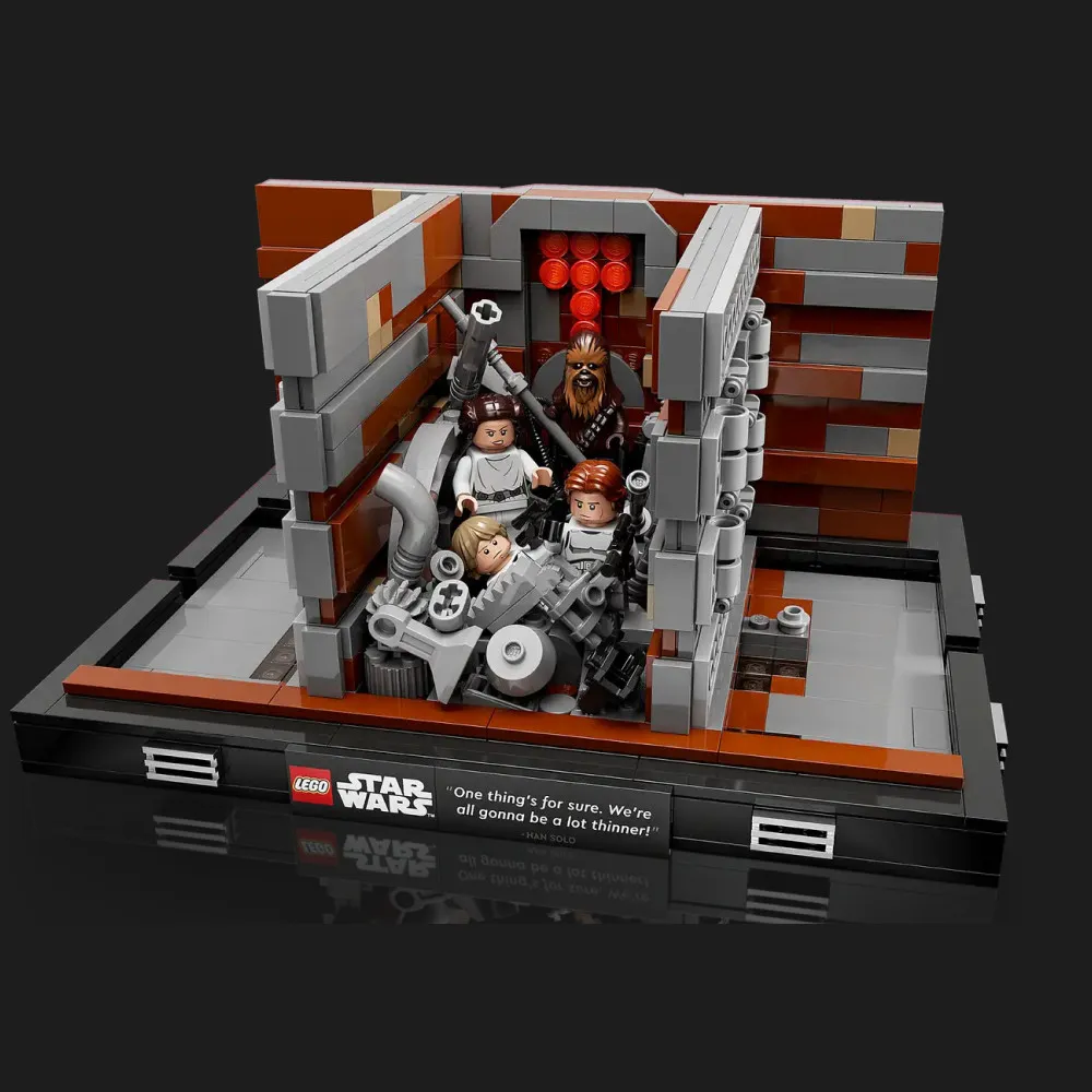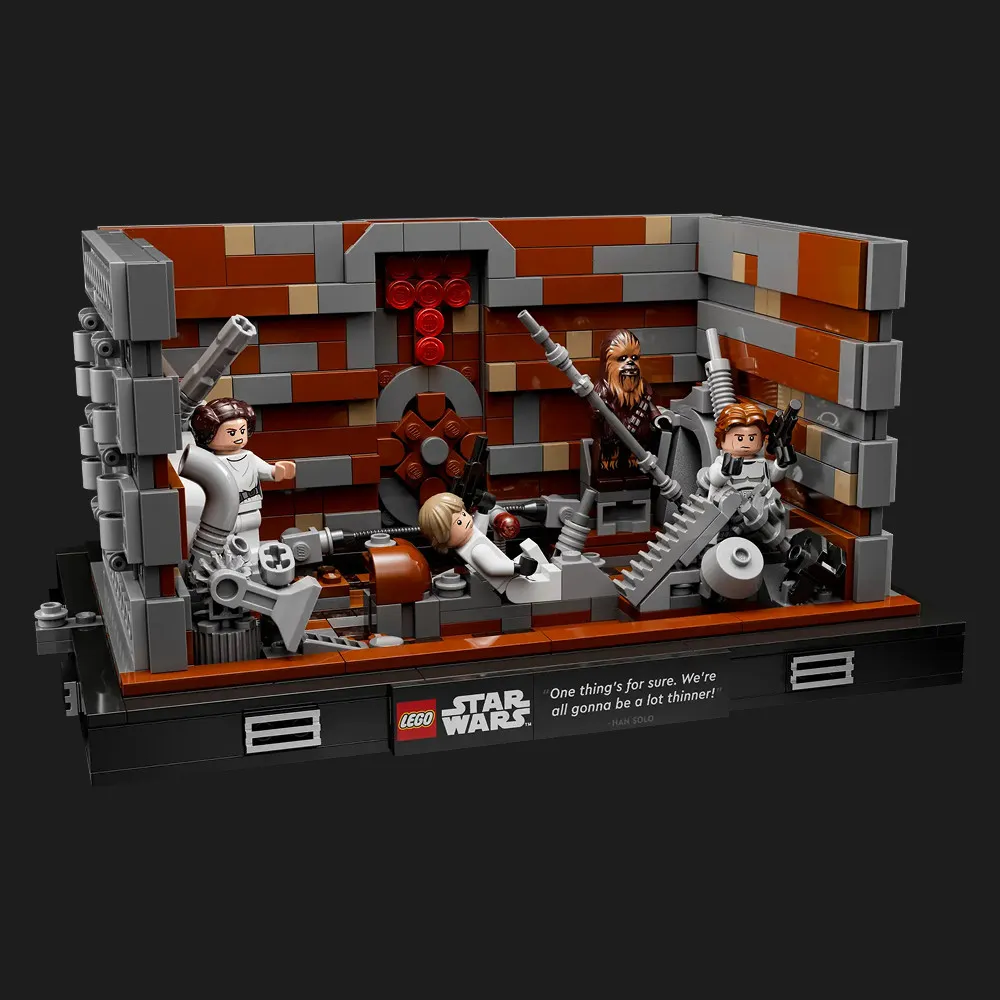 LEGO Star Wars Death Star Trash Compactor Diorama впечатляет не только сюжетной глубиной, но и технической реализацией. Сложная конструкция, продуманная механика подвижных стен, характерные текстуры и контрастные цвета — всё это создаёт эффект полного погружения в сцену. На фронтальной части базы — табличка с цитатой Хана Соло: «One thing's for sure. We're all gonna be a lot thinner!», которая добавляет фирменного юмора и подчеркивает дух оригинального фильма.
