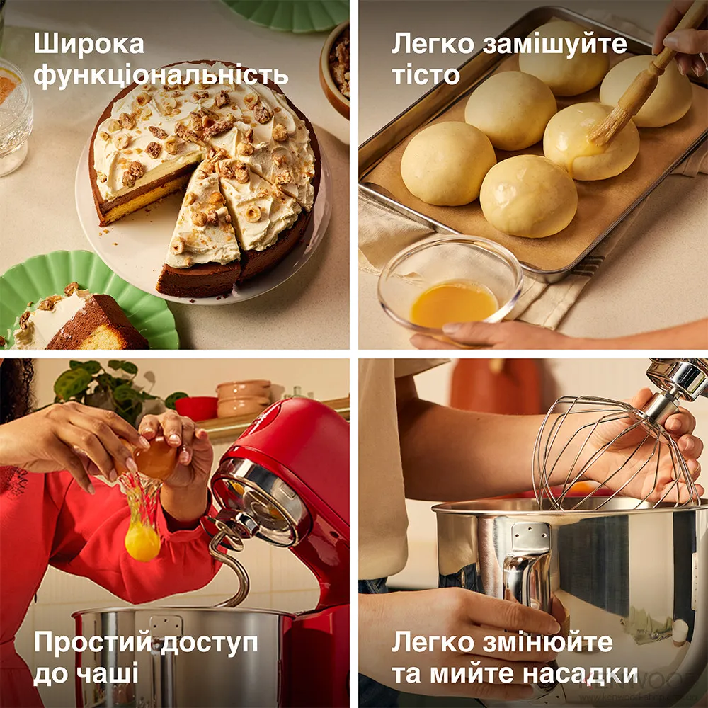 У комплекті ви отримаєте 3 насадки: гак для замісу тіста, віночок для збивання та К-насадку для універсального використання. Завдяки цьому машина однаково ефективно готує тісто для хліба, крем для торта чи повітряний мус. Також є можливість підключати додаткові насадки для розширення функціоналу.