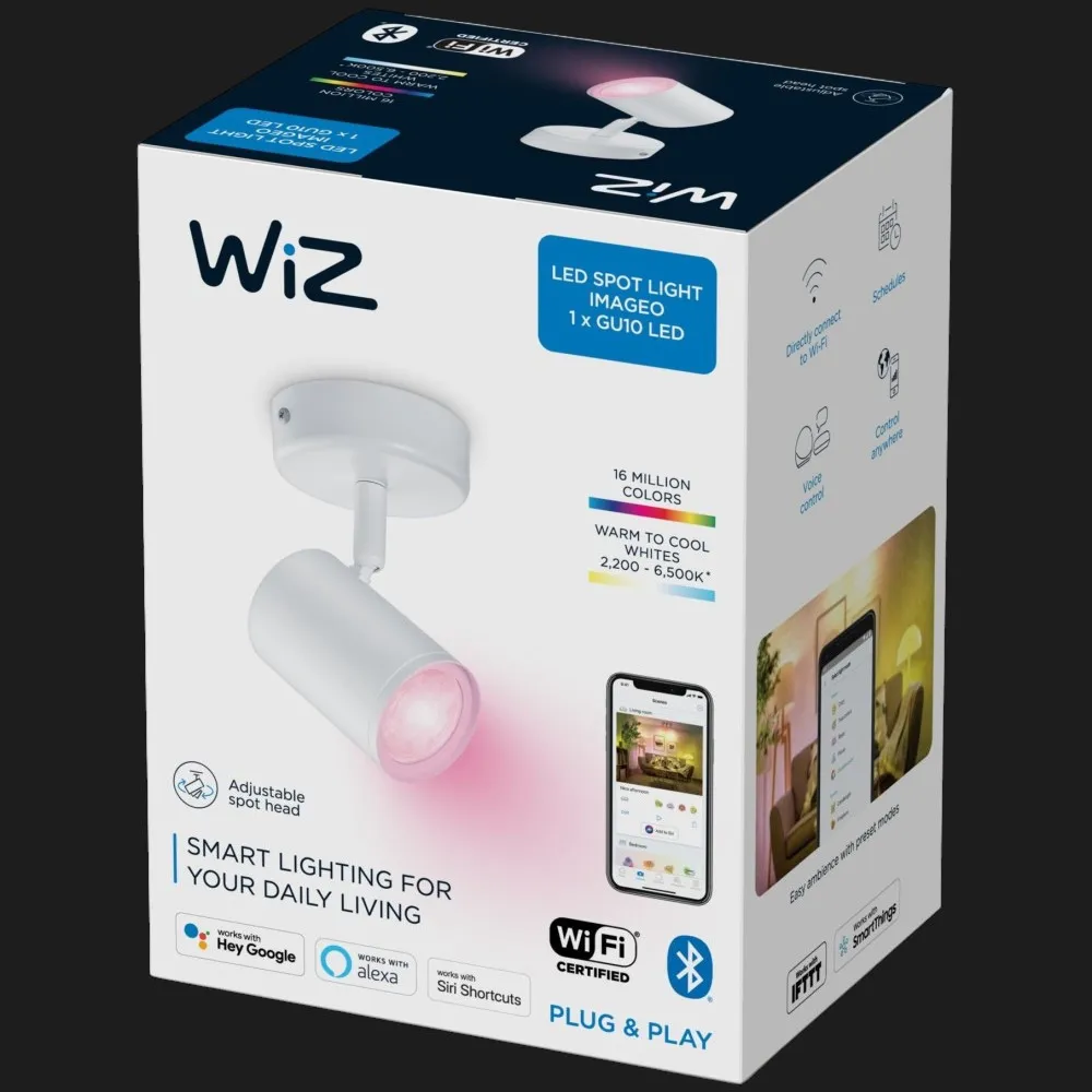 WiZ IMAGEO Spots отличается современными технологиями освещения, которые дают пользователю полный контроль над атмосферой в помещении. Благодаря поддержке Wi-Fi и Bluetooth вы можете управлять светильником через мобильное приложение или голосовых ассистентов, изменяя яркость, цветовую температуру и цветовые оттенки в зависимости от настроения или времени суток.