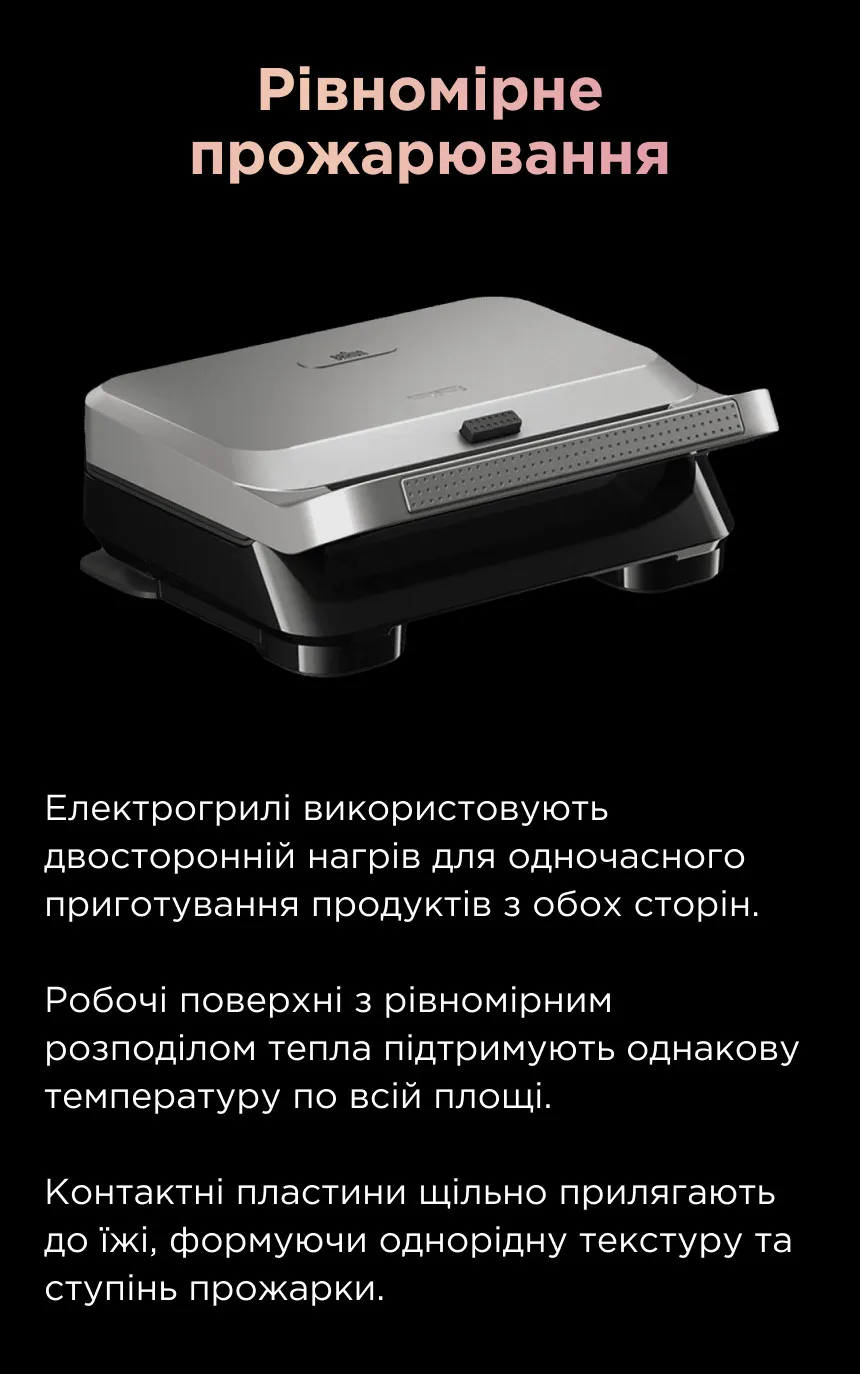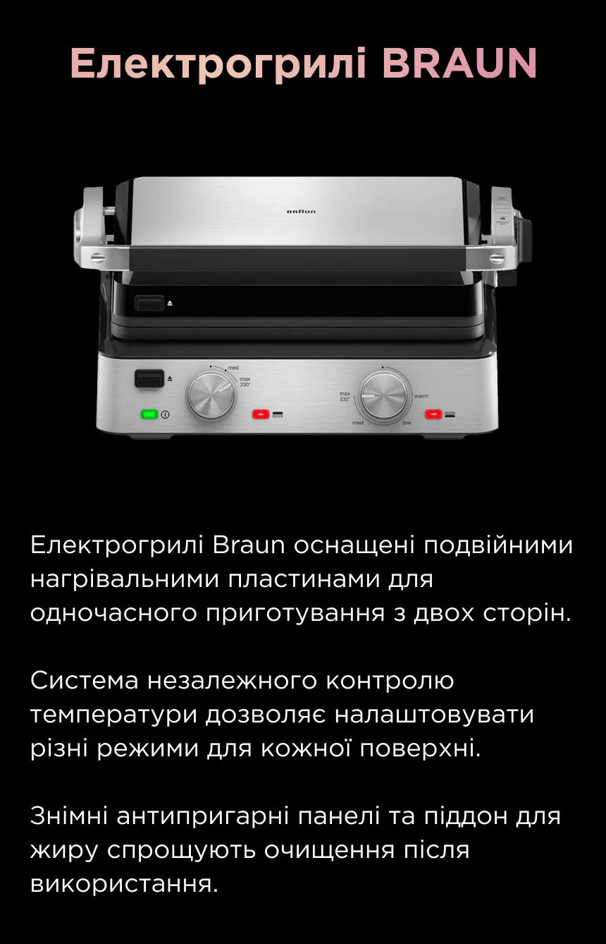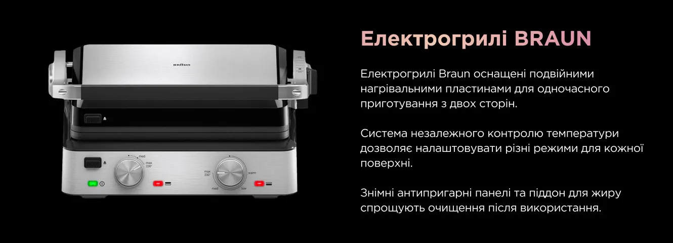 Сімейство Braun Multigrill на чолі з Braun Multigrill 9 Pro — це ще один вартий вашої уваги електричний гриль, який запропонує вам більше залучення в процес приготування, ніж Tefal OptiGrill. Він має за свою основу багатофункціональну філософію, тому постачається з різними насадками для грилювання, сендвічів, вафель, панкейків тощо.