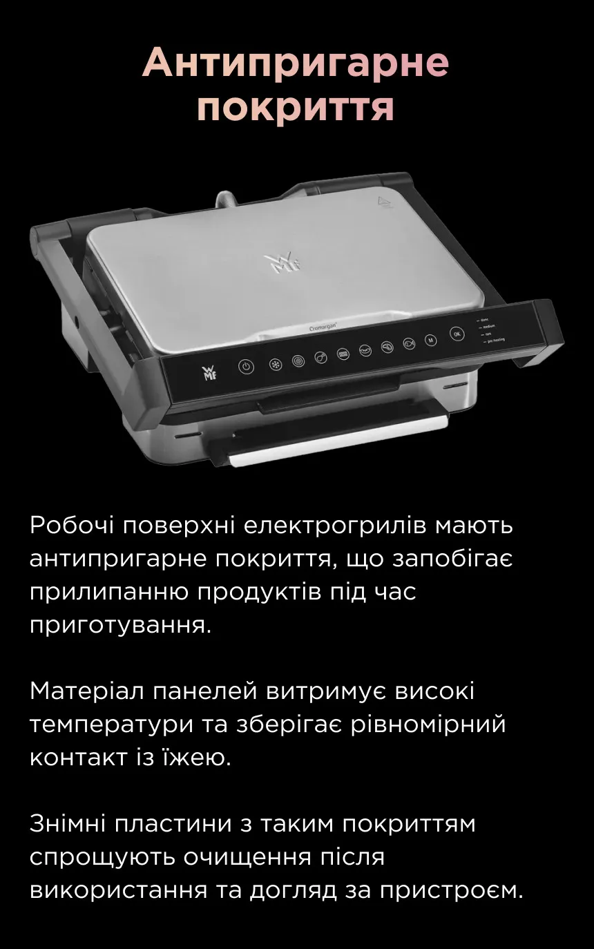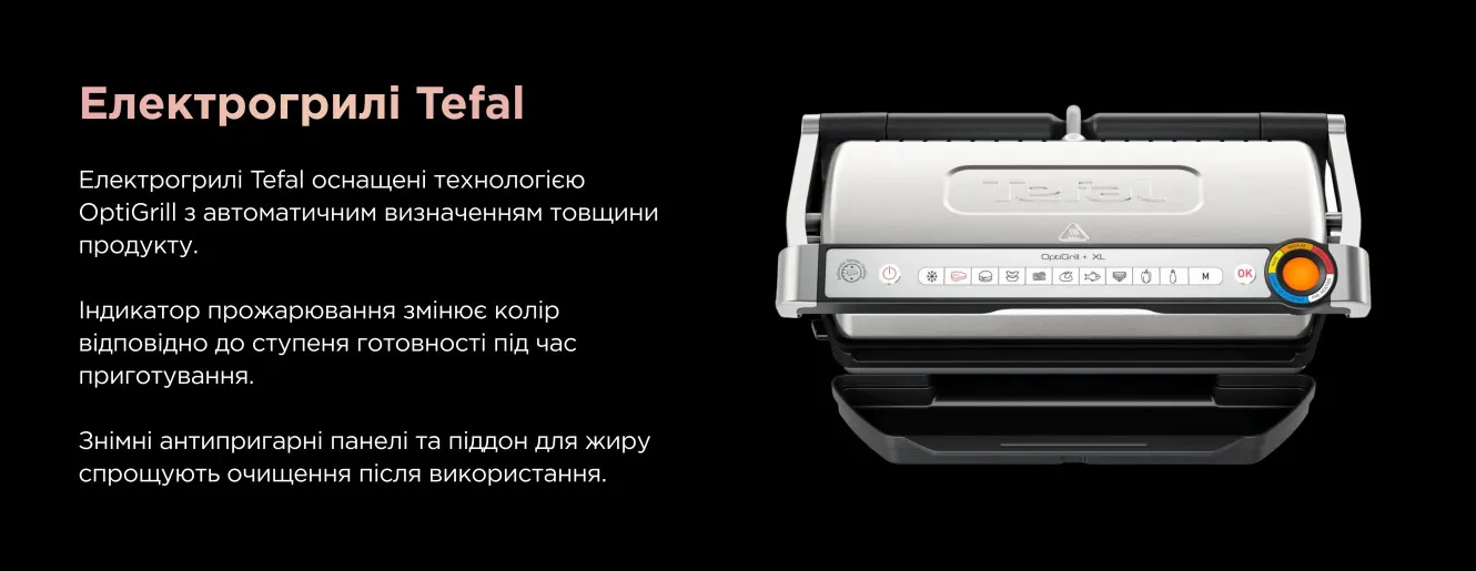 Під час приготування Tefal OptiGrill використовує інтелектуальний датчик, який визначає тип продуктів та їх внутрішню температуру, щоб автоматично регулювати час для отримання оптимального просмаження. Він надає м’ясу та птиці насиченого та соковитого смаку, якого ви й прагнете отримати від гриля, а також функціонує як прес для створення сендвічів паніні, кебабу тощо. Для недосвідчених домашніх кухарів автоматична робота Tefal OptiGrill буде справжнім порятунком, а також буде корисним інструментом для всіх, хто швидко втомлюється від приготування їжі.
