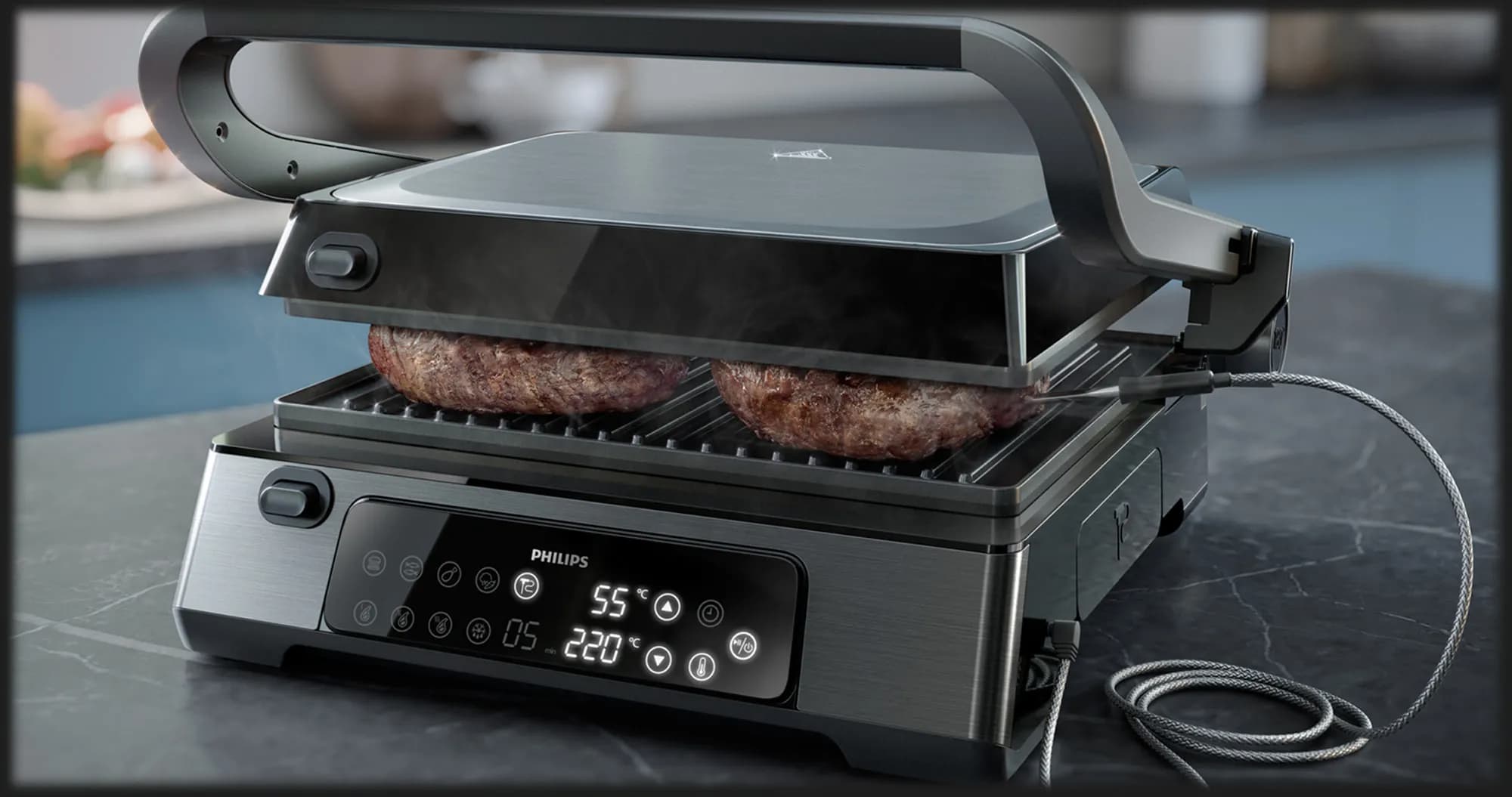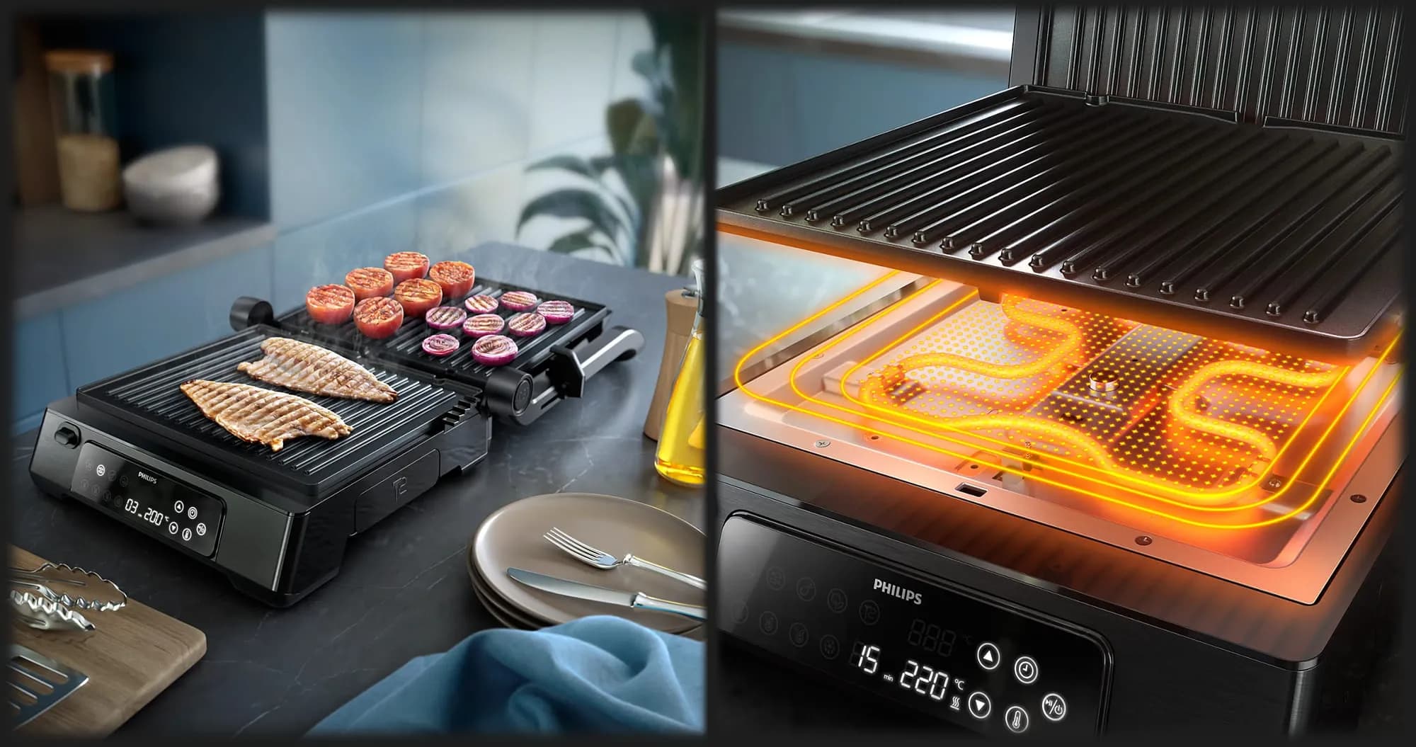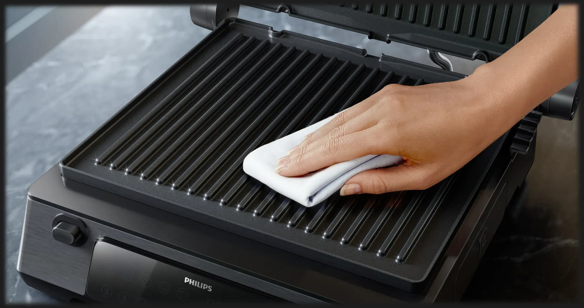 Електричні грилі Philips зберігають чисту, сучасну естетику, яка бездоганно вписується в більшість кухонь, саме тому модельний ряд виглядає практично та вишукано, відображаючи акцент бренду на функціональності, а не на надмірності. Цей стриманий дизайн чудово поєднується з надійною продуктивністю, тож стане гарним доповненням вашої кухні.